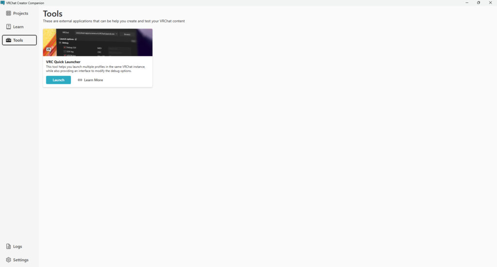 VCCの「Tools」タブの中ある「VRC Quick Launcher」の「Launch」をクリックします。