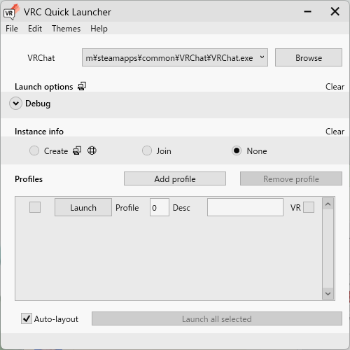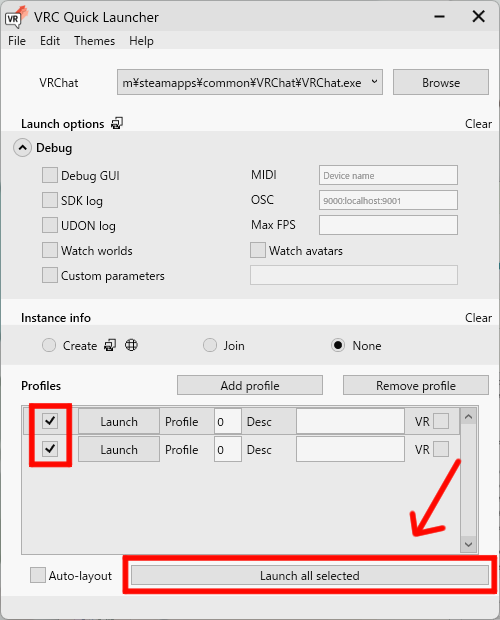 なので、”VRC Quick Launcher”の「Add Profile」から起動したい数を作成し、チェックをいれて「Launch all selected」で起動してみてください!